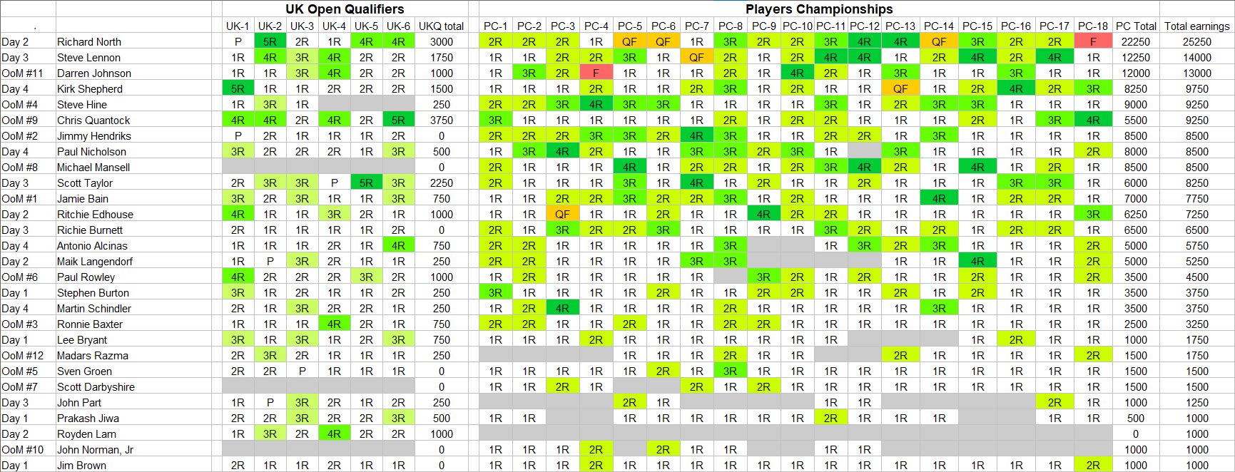 Mest iøjnefaldende er Richard Norths præsationer. Richard North spillede sig så sent som i søndags i sin første PDC-finale nogensinde, alt i mens det blot 2 ud af 18 gange er blevet til et nederlag i 1. runde. En præstation som selv nogle af top-spillerne har svært ved at matche, hvilket udmærker sig med Norths placering som nummer 37 på den indeværende ProTour sæson. Til sammenligning er Jeffrey de Graaf, som er den mest succesfulde spiller af 2016-Q-School spillerne placeret som nummer 46.
